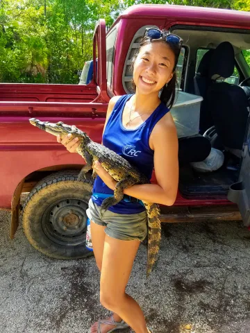 ARCS Scholar Helen Sung carefully takes a sample from a crocodile during a trip to Belize.
