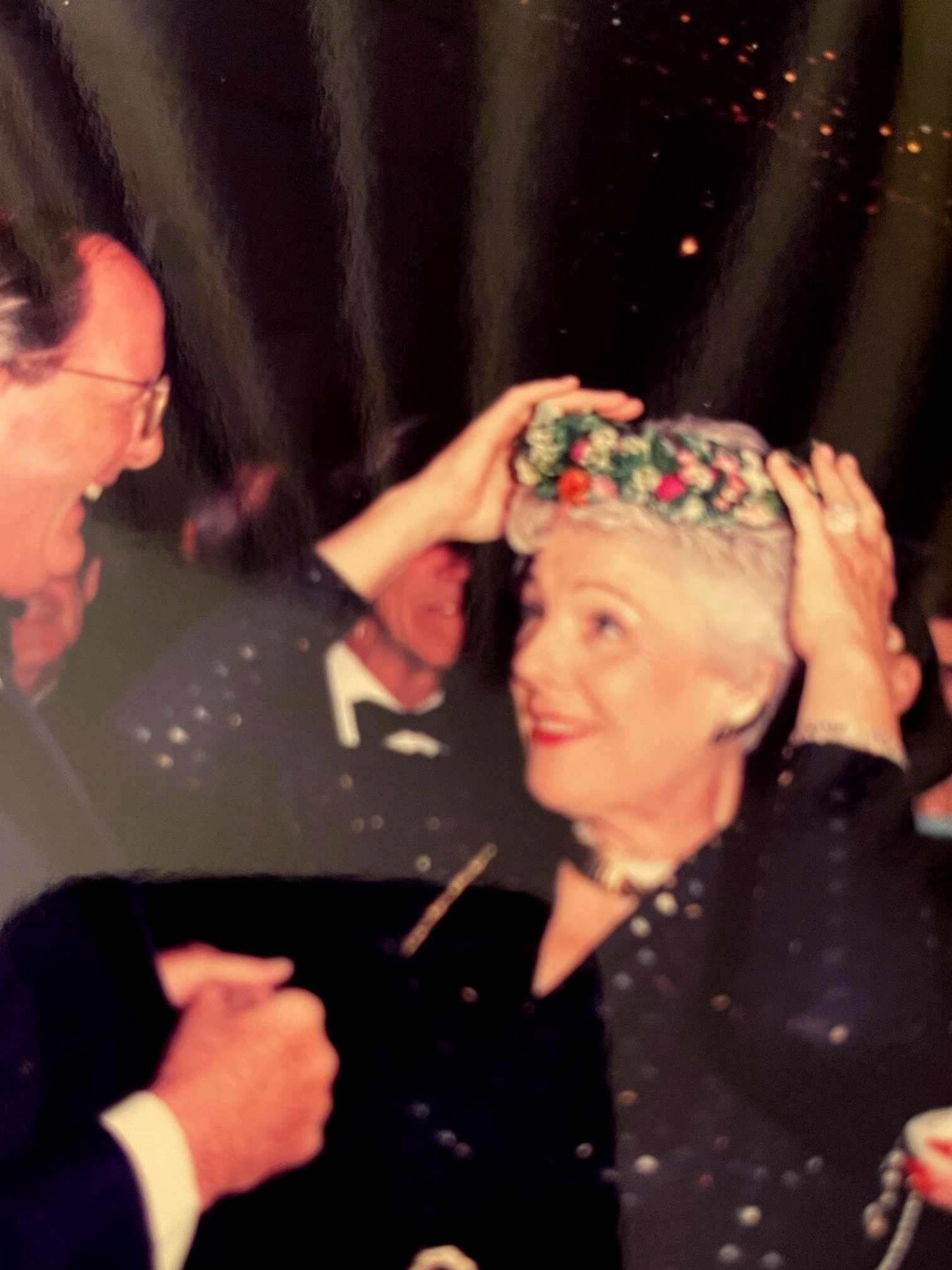Ann Russell Miller places a flower crown on her head