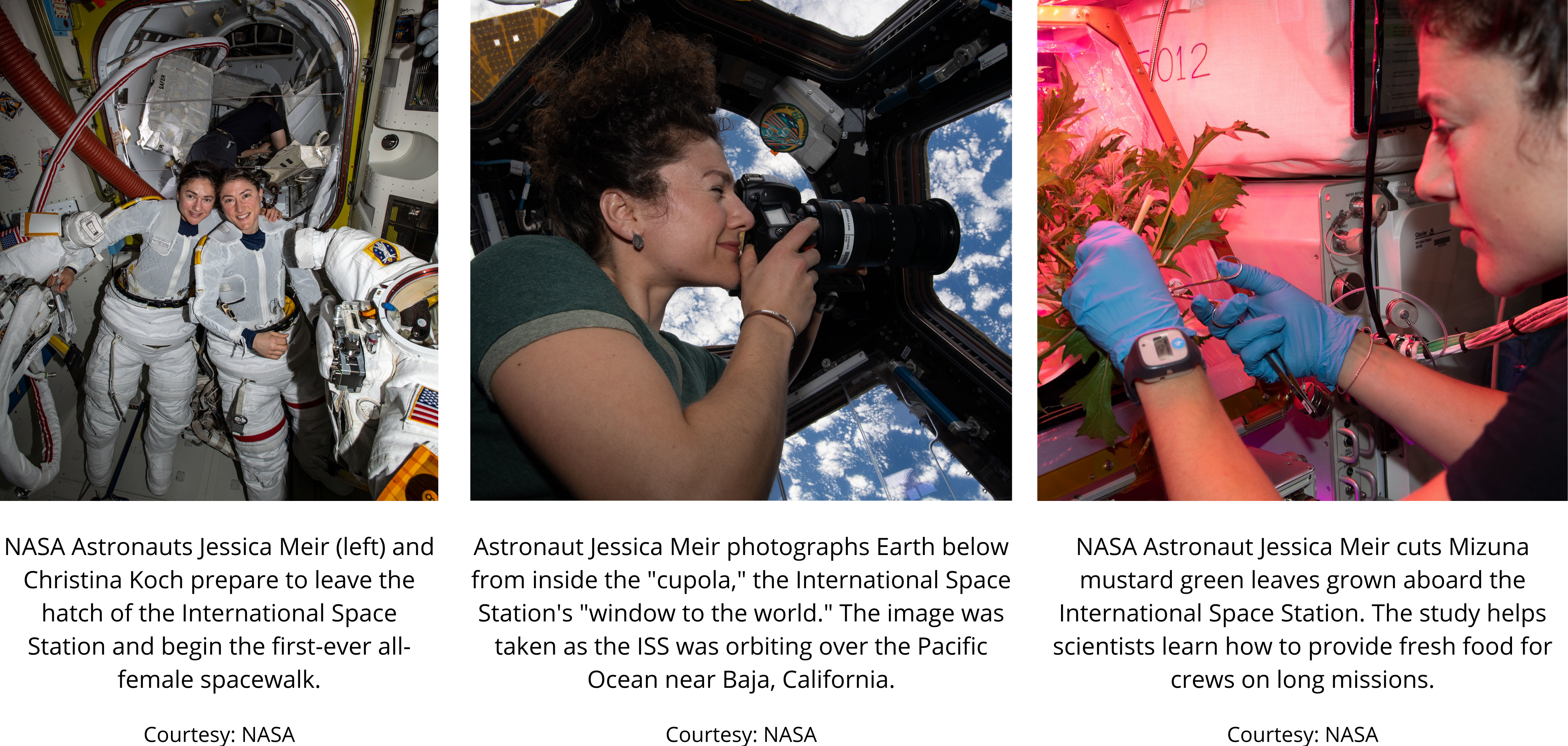 To see more pictures of Jessica Meir on her spacewalks and missions, visit NASA's photo gallery. And to see images of other astronauts in training and performing tasks on other space missions, visit this NASA gallery.